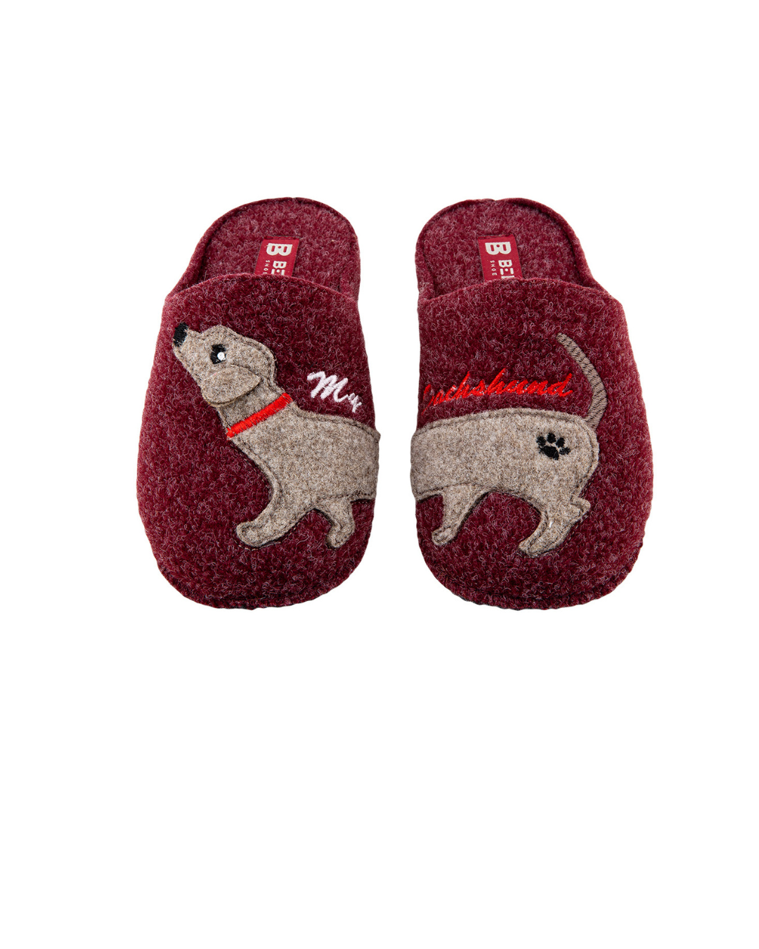 Papuci de damă BELSTA, închiși, din fetru italian bordo, decorați cu broderie în formă de cățel (Teckel)