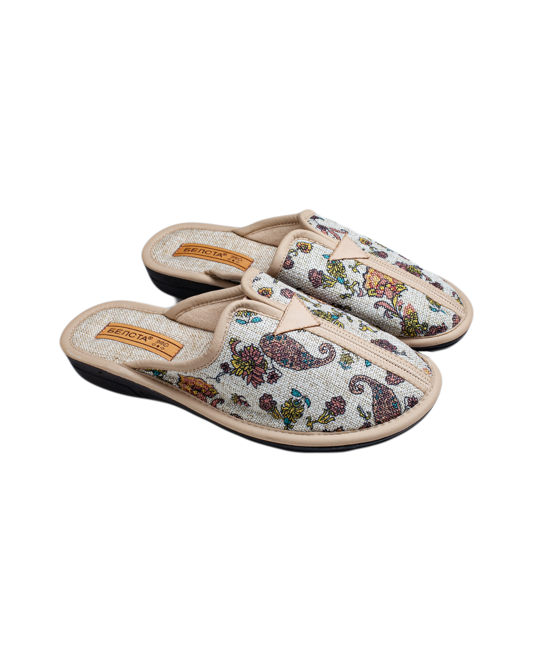 Papuci de damă BELSTA, închiși, din material textil cu imprimeu, decorați cu inserție din piele ecologică