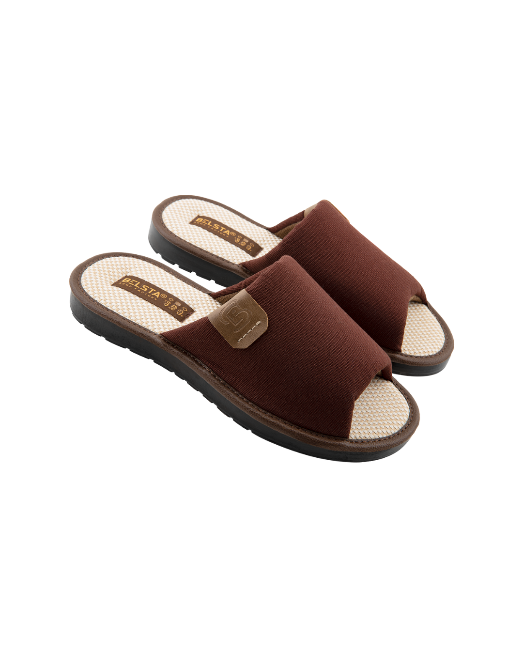 Papuci de damă BELSTA, deschiși, din țesătură de bumbac maro, decorați cu eco-piele și logo-ul fabricii