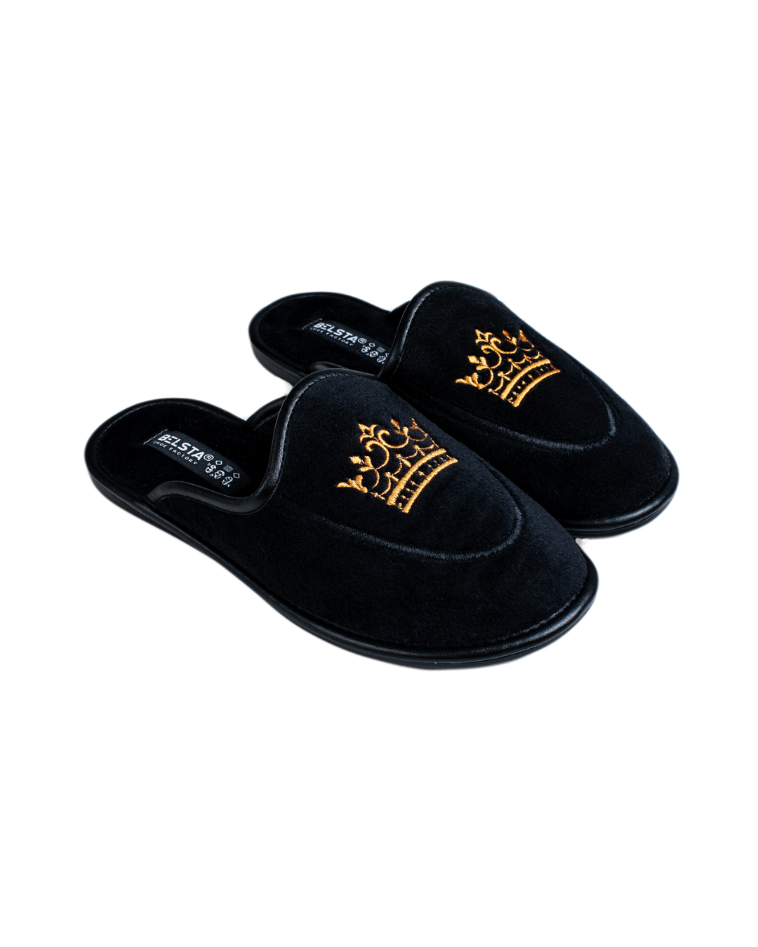 Papuci de damă BELSTA, închiși, din velur negru, decorați cu broderie în formă de coroană