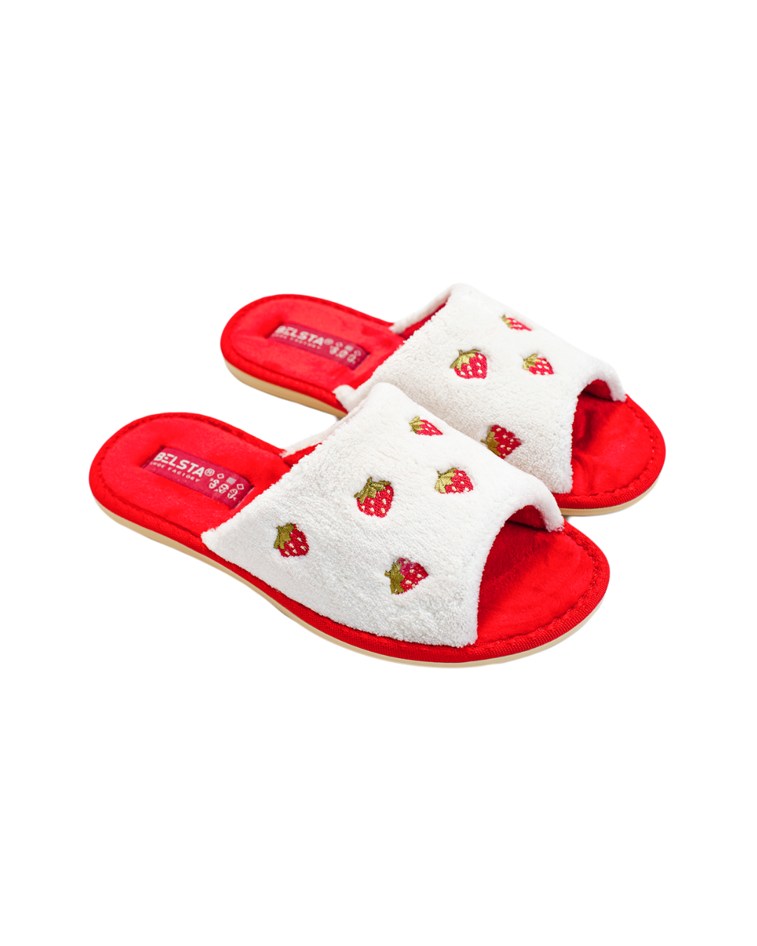 Papuci de damă BELSTA, deschiși, din frotir alb, decorați cu broderie de căpșuni