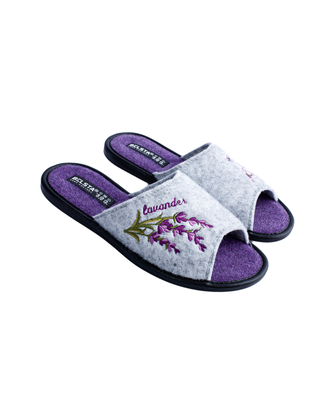 Papuci de damă BELSTA, deschiși, din pâslă italiană gri, decorați cu broderie cu ramură de lavandă