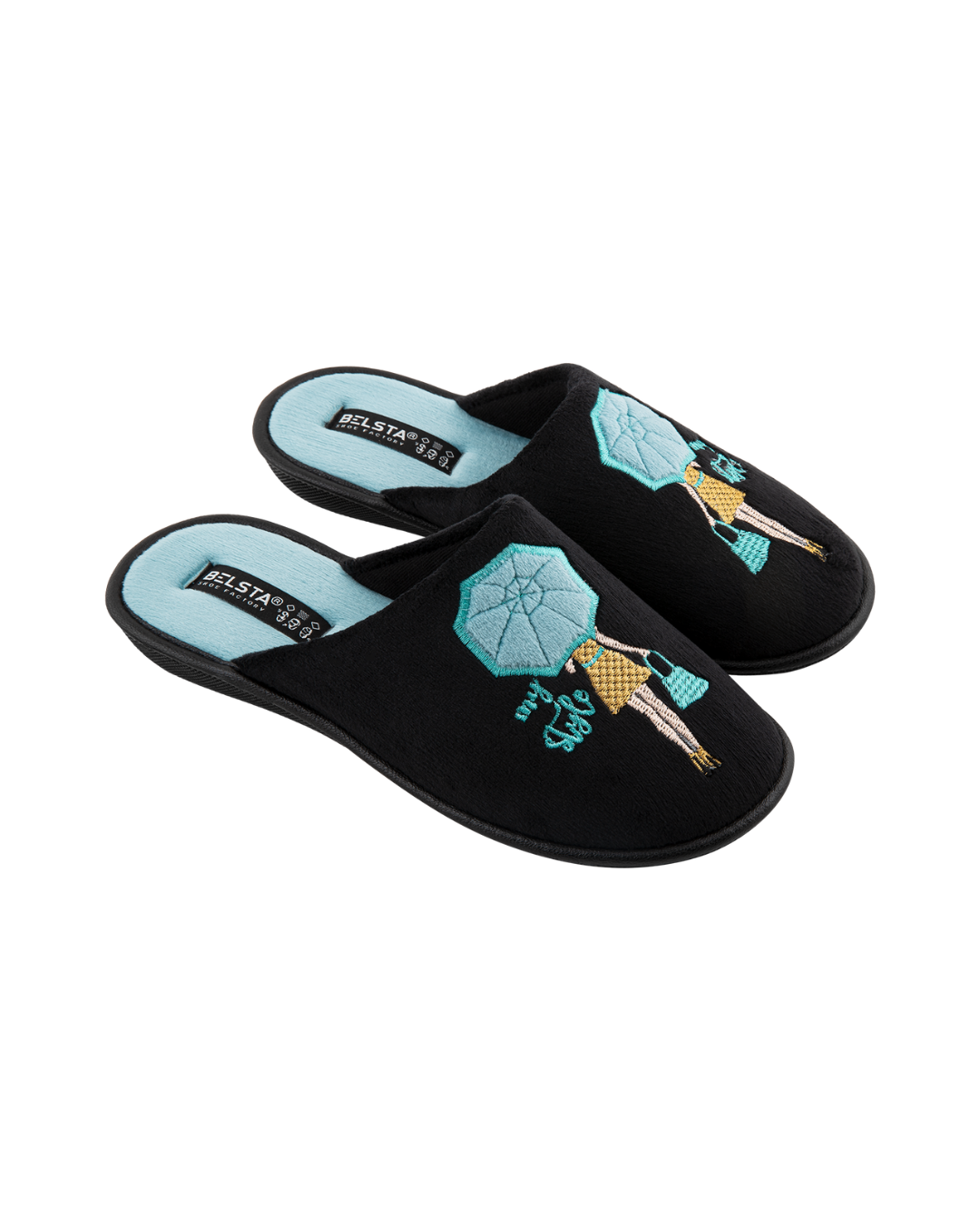 Papuci de damă BELSTA, închiși, din velur negru, decorați cu broderie elegantă „Fată cu umbrelă”