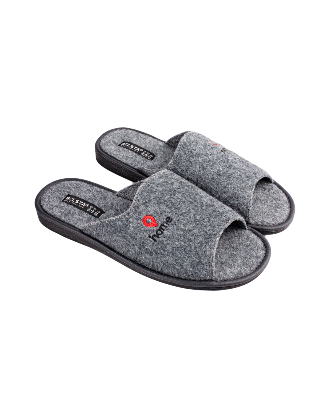 Papuci de bărbați deschiși BELSTA din pâslă italiană gri, decorați cu broderie „HOME”. Model confortabil,...