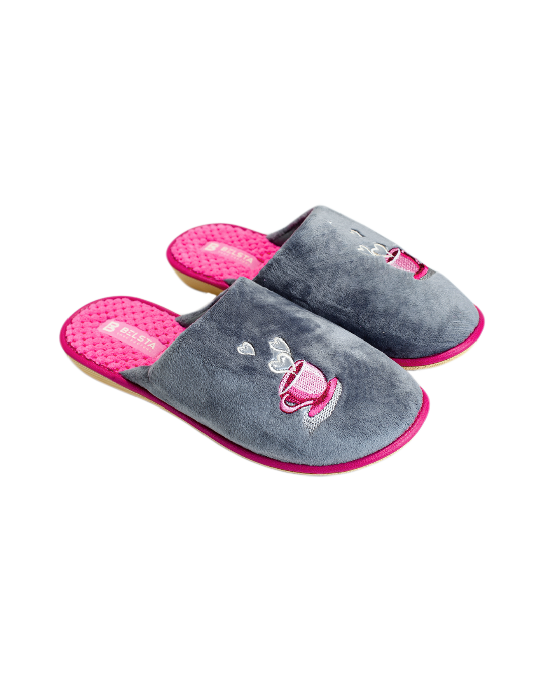 Papuci de damă închiși BELSTA din catifea moale gri, decorați cu o ceașcă de cafea...