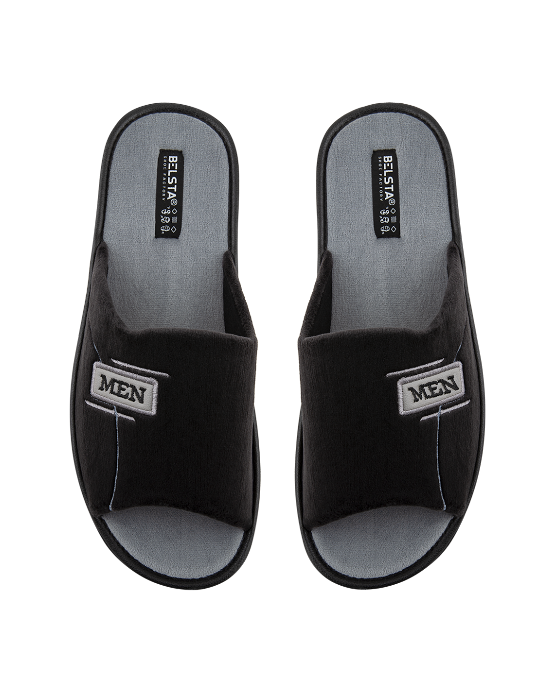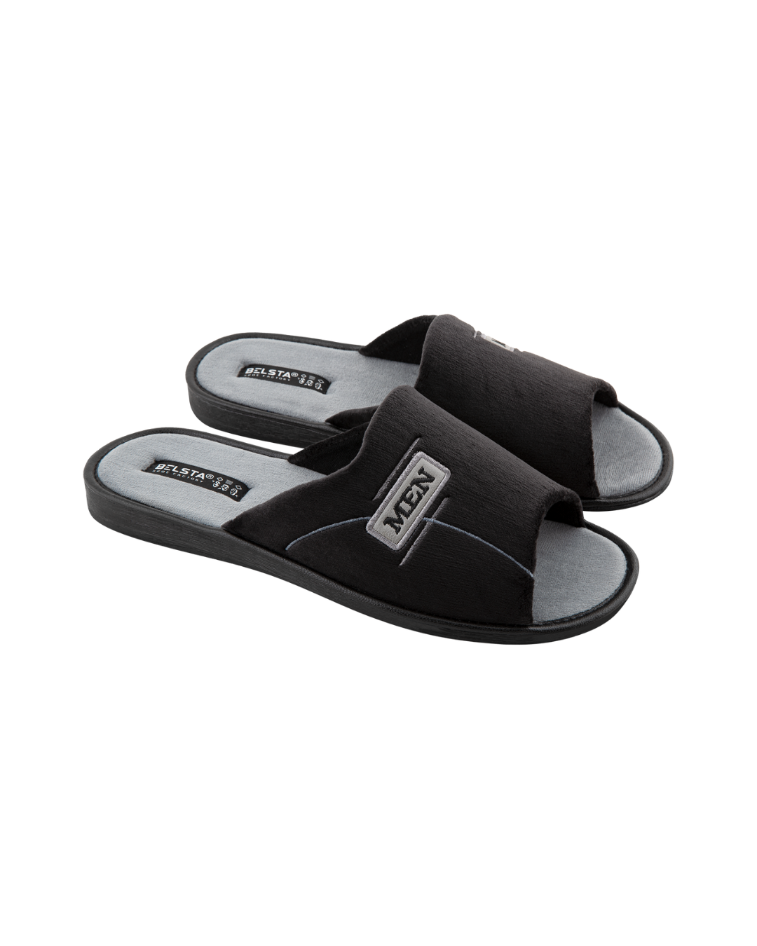 Papuci de bărbați deschiși BELSTA din catifea neagră, decorați cu inserție din piele ecologică și broderie „MEN”. Branțul este realizat din catifea gri. Model confortabil, potrivit pentru purtare în sezonul de tranziție.