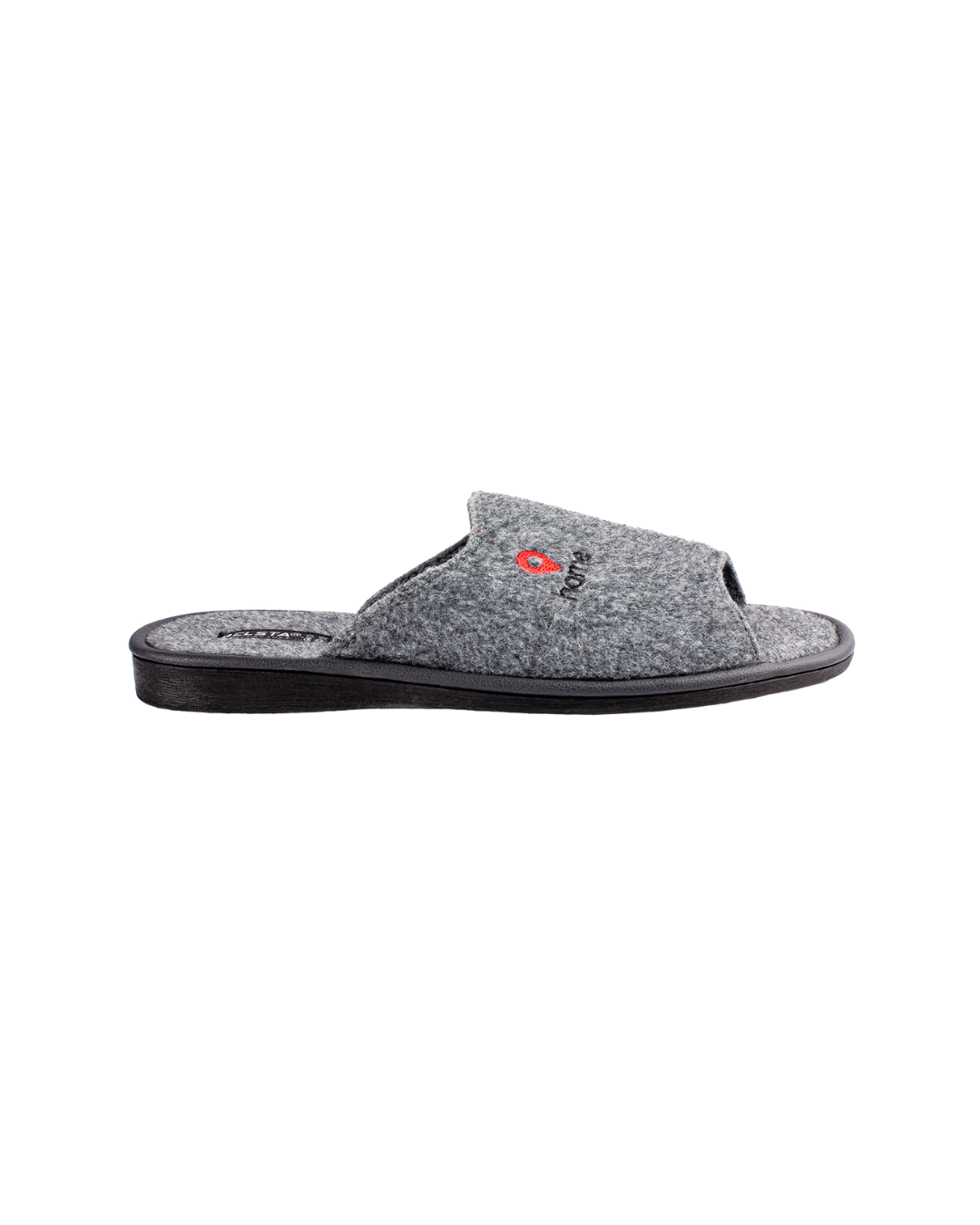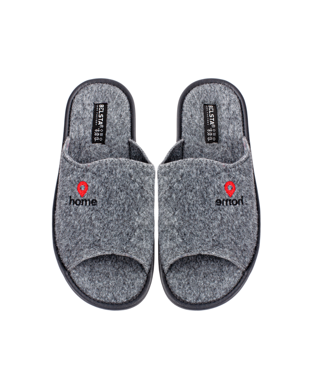Papuci de bărbați deschiși BELSTA din pâslă italiană gri, decorați cu broderie „HOME”. Model confortabil, potrivit pentru purtare în sezonul de tranziție. Pâsla păstrează căldura și permite circulația aerului.