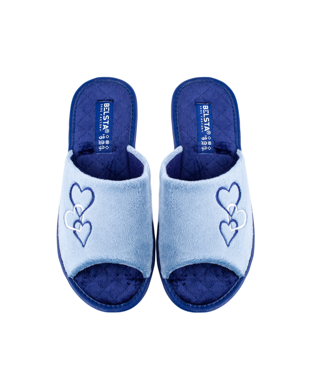 Papuci de damă deschiși BELSTA din catifea albastră, decorați cu broderie în formă de inimioare. Branțul este realizat din catifea albastru-închis. Model confortabil, potrivit pentru purtare în sezonul cald.