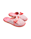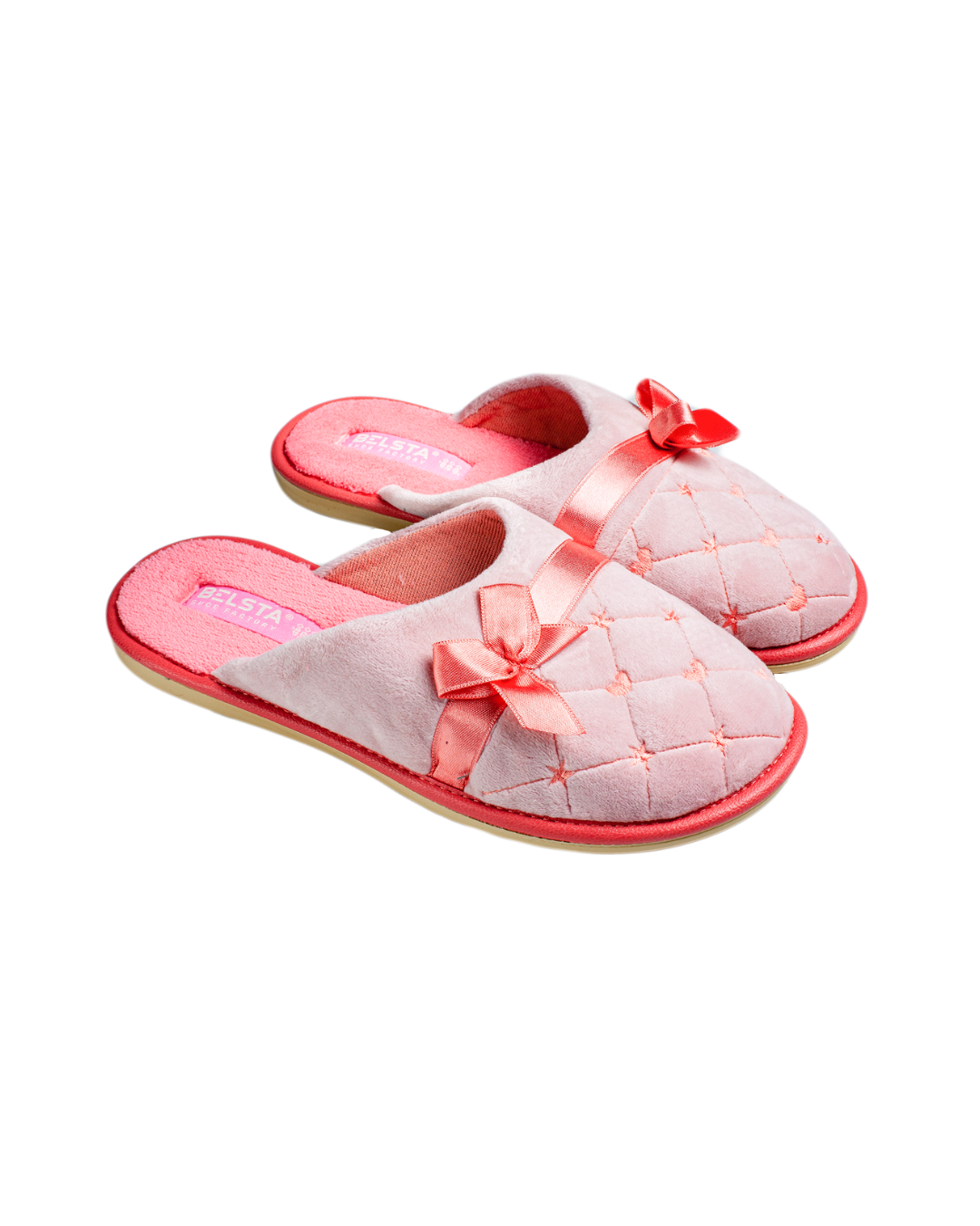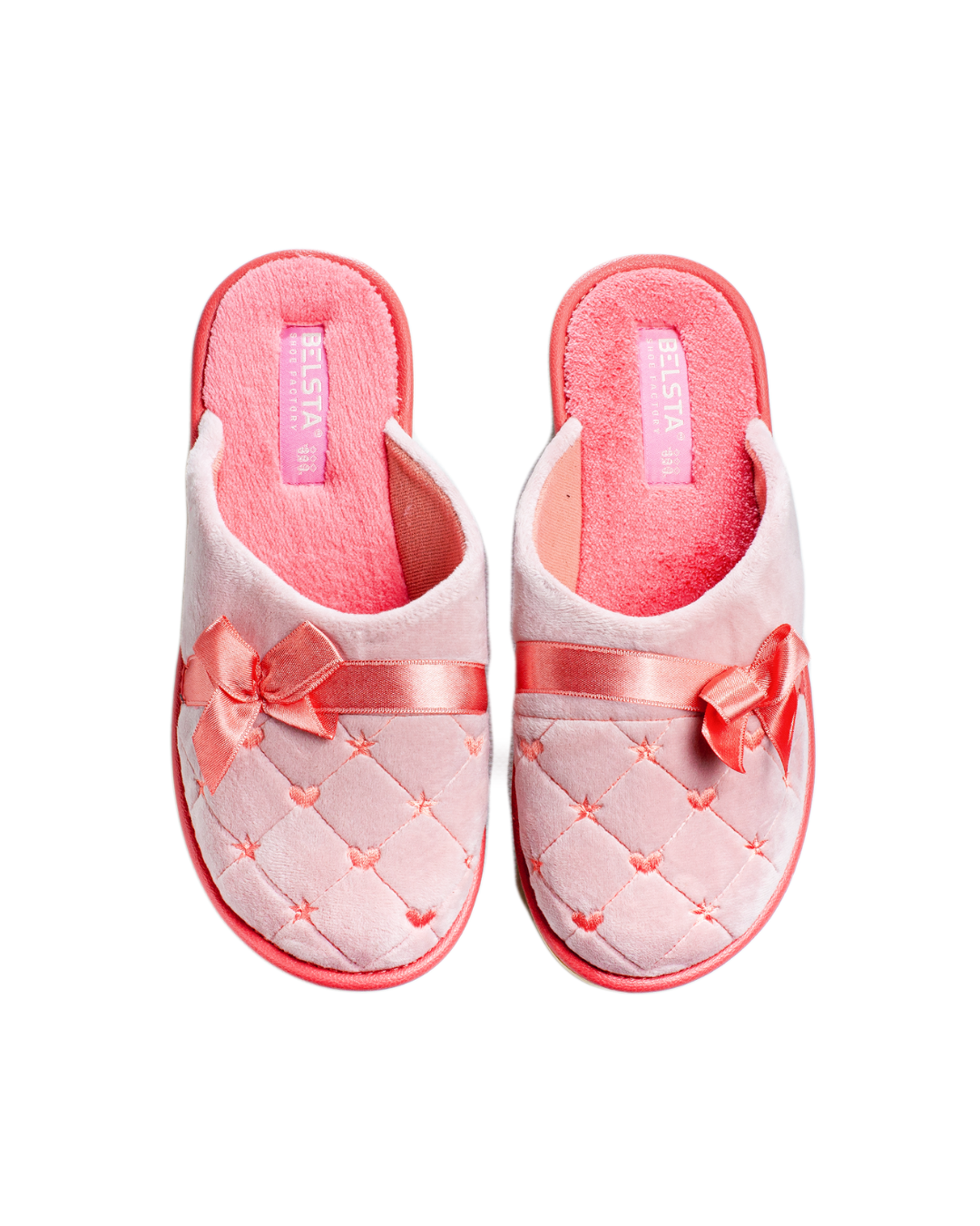 Papuci de damă BELSTA din catifea matlasată roz, decorați cu broderie și fundiță satinată. Branțul este realizat din material frotir roz. Model potrivit pentru purtare în perioada rece.