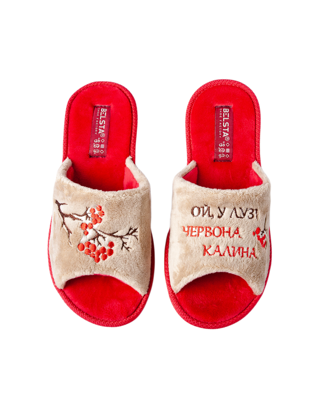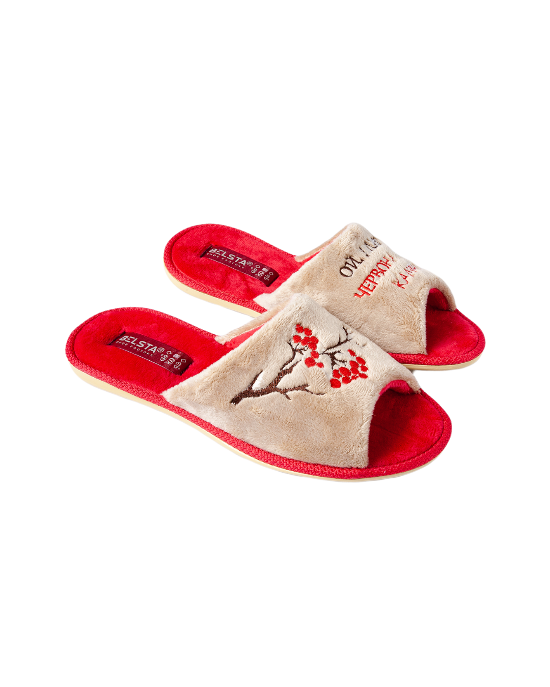 Papuci de damă deschiși BELSTA din catifea crem, decorați cu broderie patriotică. Branțul este realizat din catifea roșie moale. Model confortabil și elegant, potrivit pentru purtare în sezonul de tranziție.