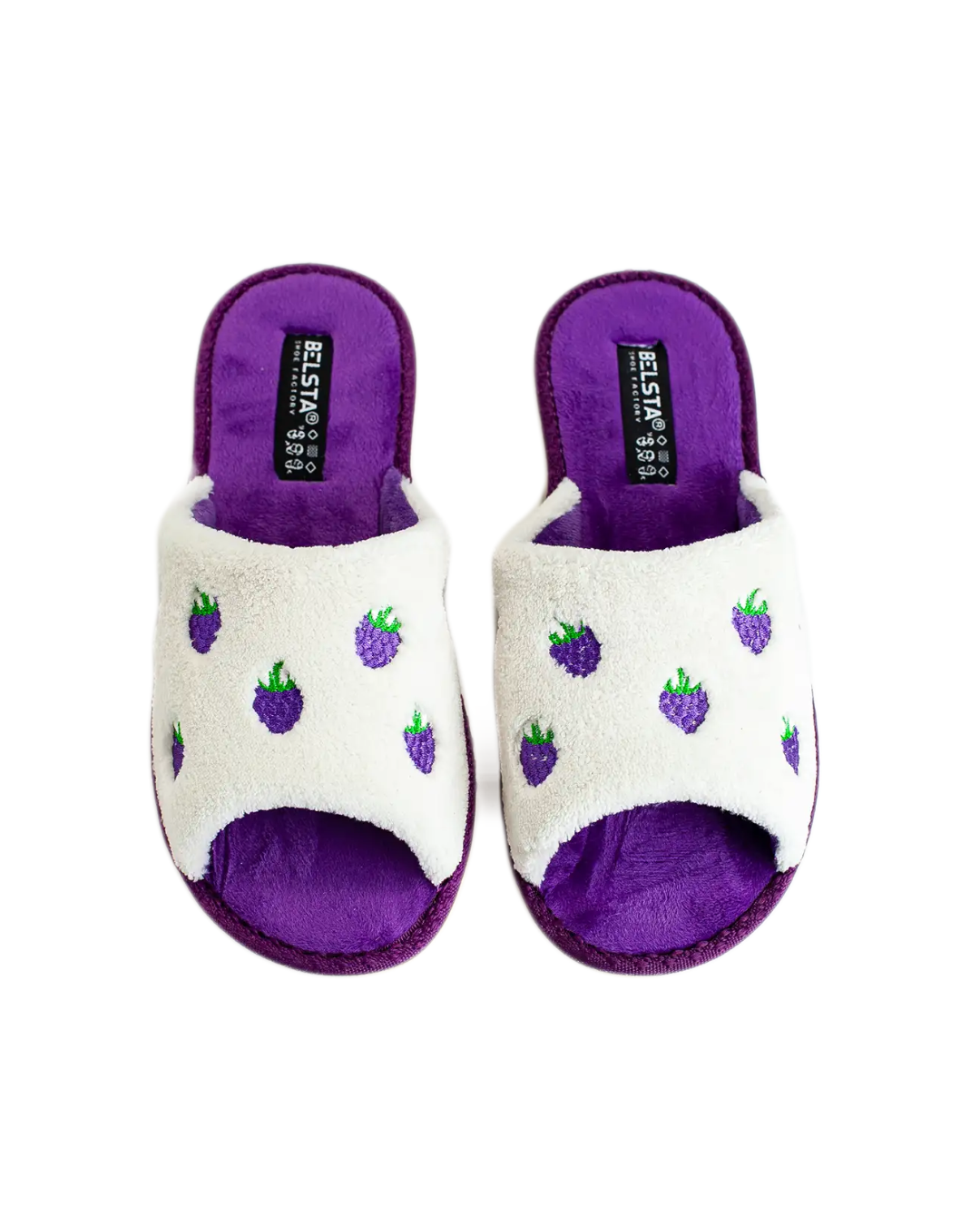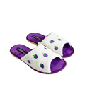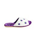 Papuci de damă deschiși BELSTA din material frotir alb, decorați cu broderie sub formă de mure. Branțul este realizat din catifea liliachie. Model călduros, potrivit pentru purtare în sezonul de tranziție.