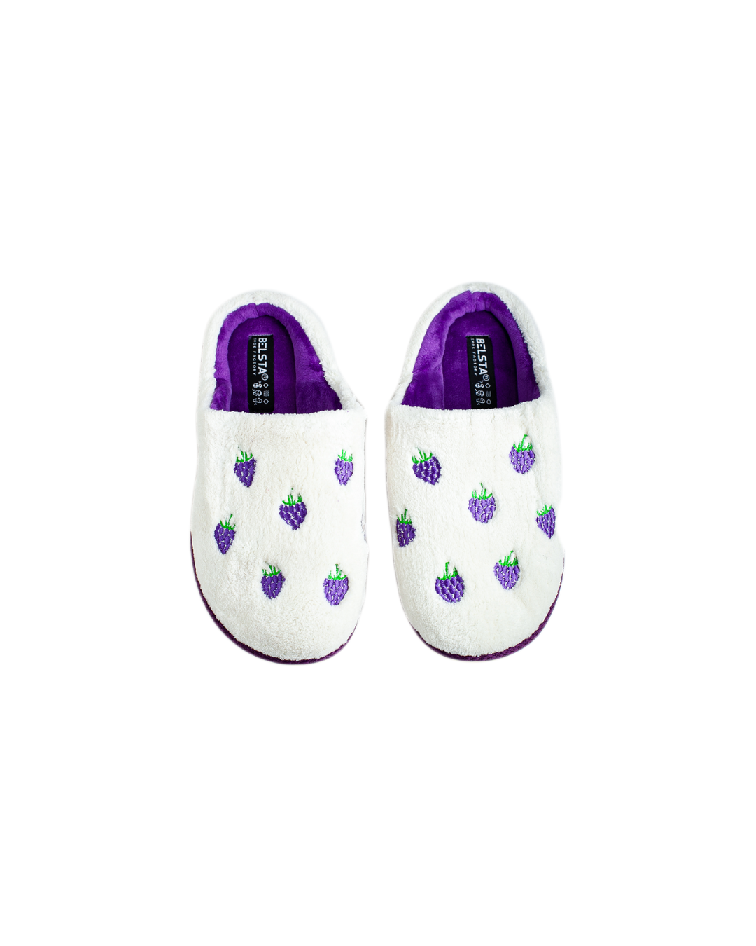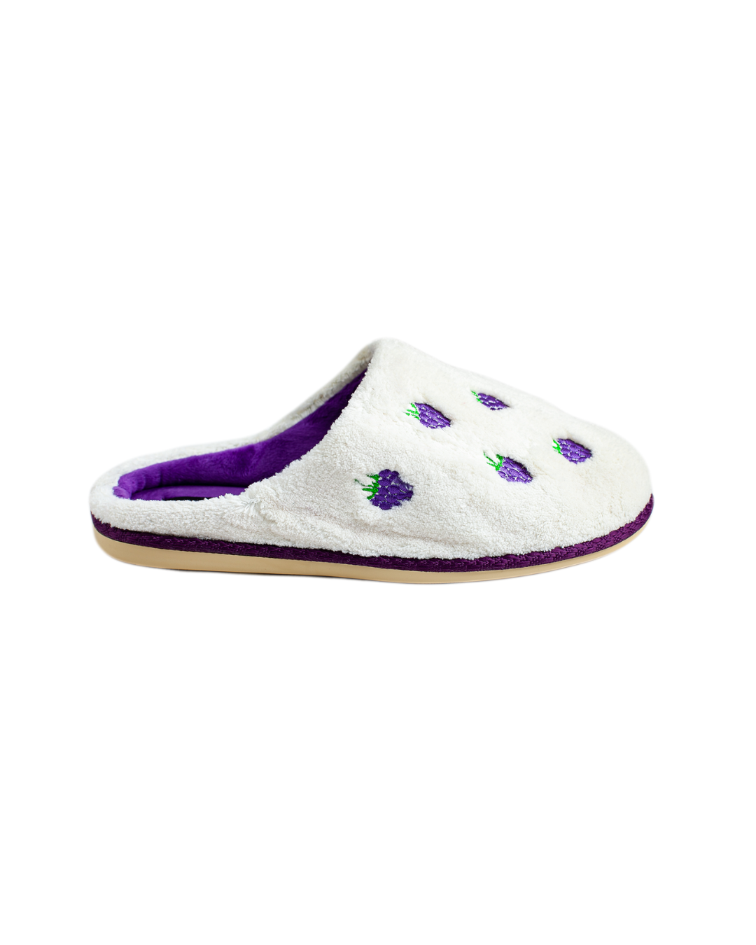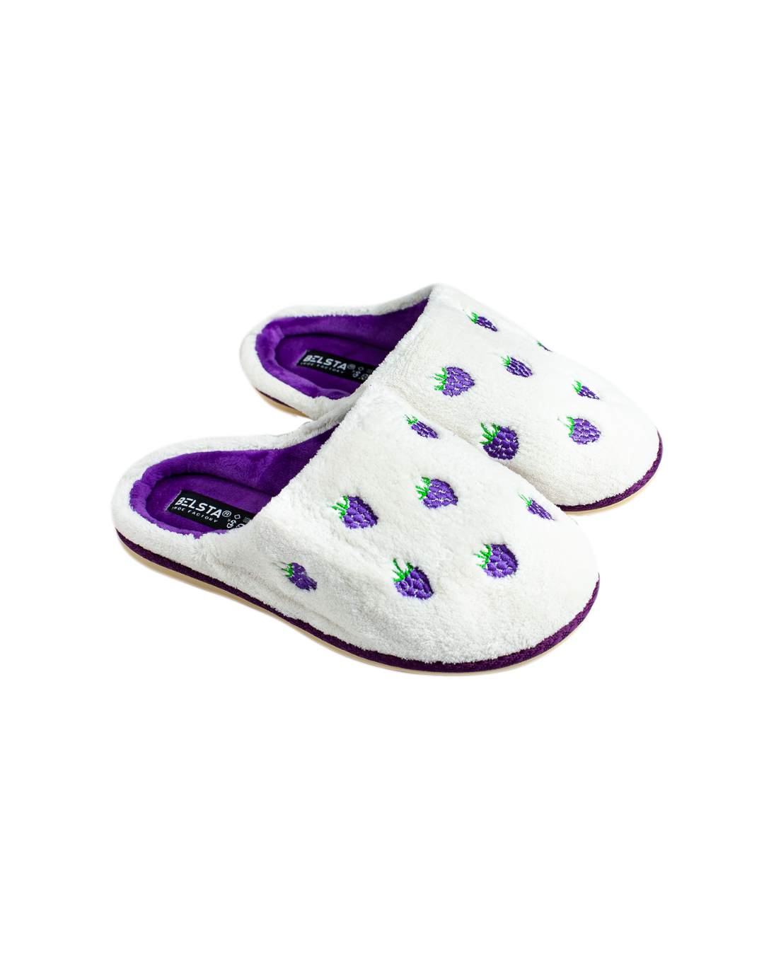 Papuci de damă închiși BELSTA din material frotir alb, decorați cu broderie în formă de mure. Branțul este realizat din catifea liliachie moale. Model foarte călduros, potrivit pentru purtare în sezonul toamnă-iarnă.