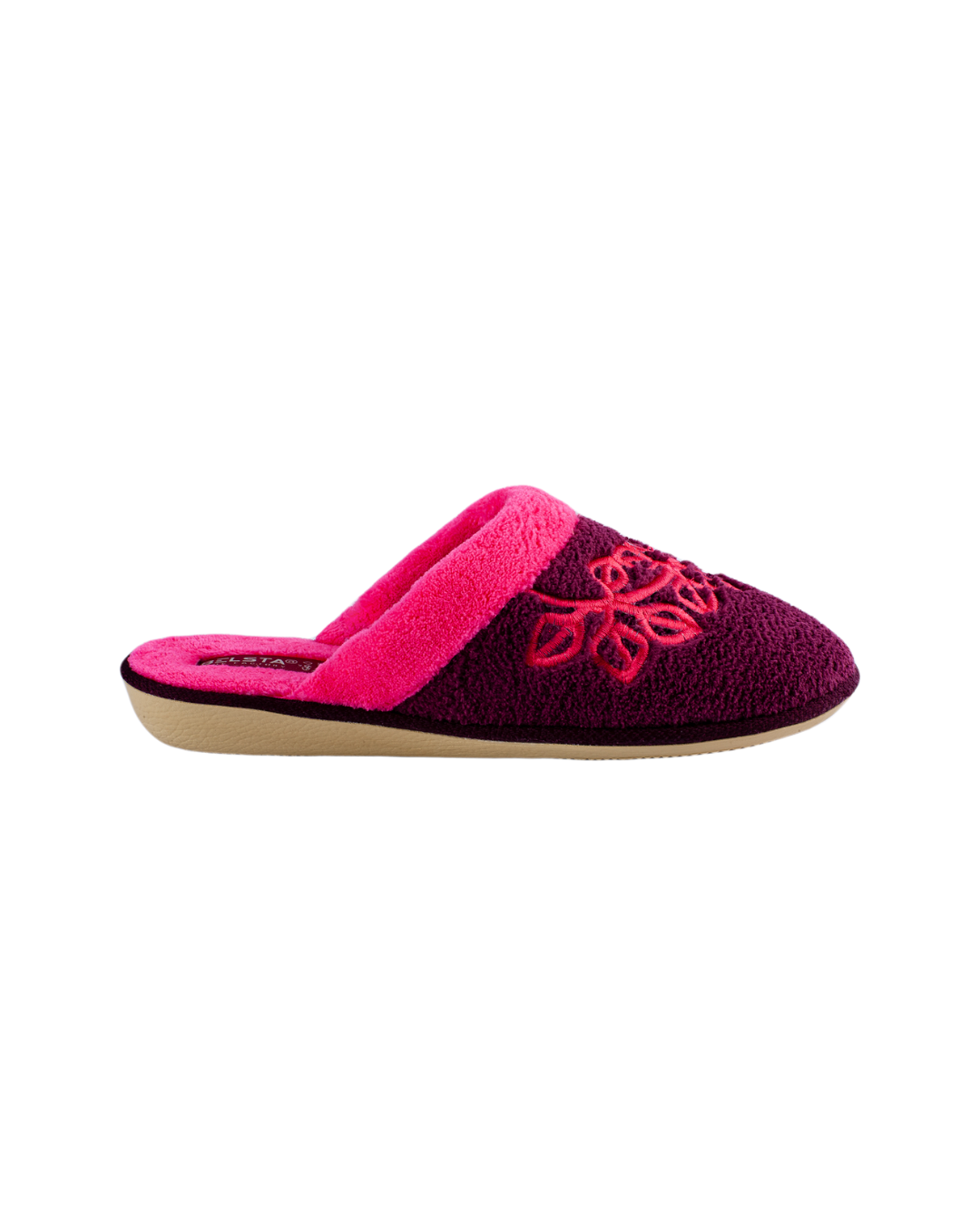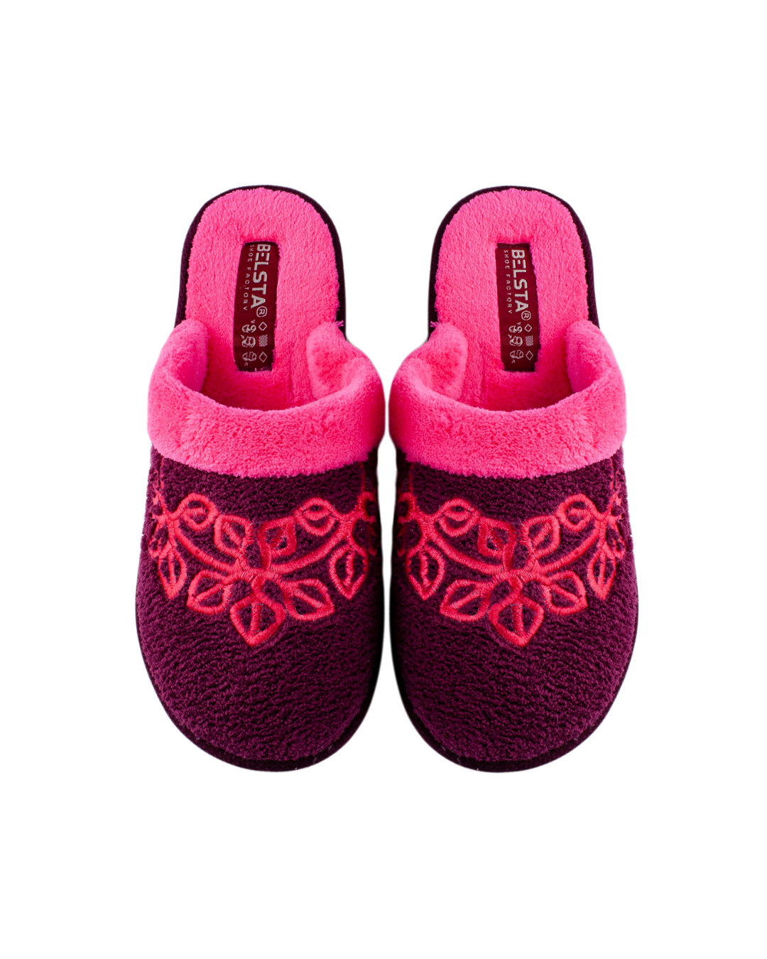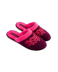 Papuci de damă închiși BELSTA din material frotir bordo cu manșetă roz intens, decorați cu broderie decorativă elegantă. Model foarte călduros, potrivit pentru purtare în sezonul toamnă-iarnă.