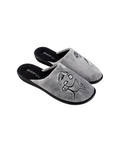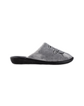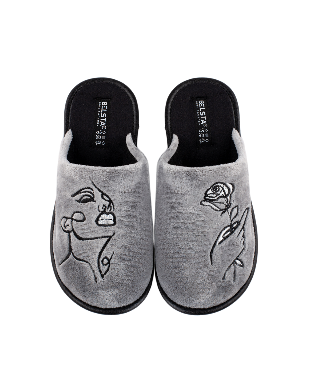 Papuci de damă închiși BELSTA din catifea gri, decorați cu broderie originală reprezentând o siluetă feminină cu trandafir. Branțul este realizat din catifea neagră moale. Model elegant și confortabil, potrivit pentru sezonul de tranziție și cel rece.