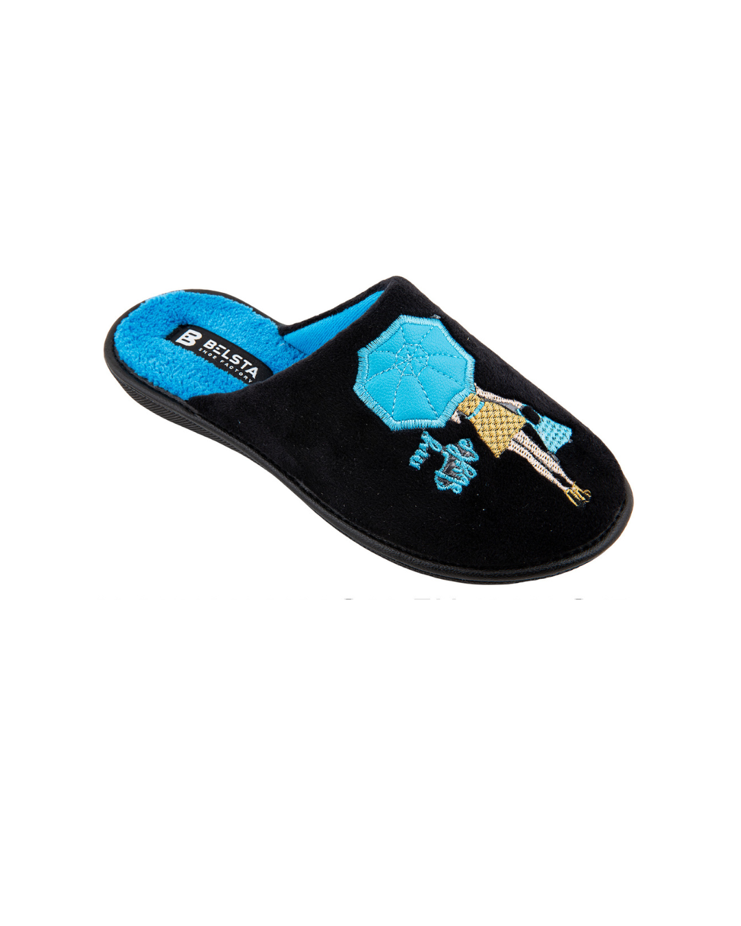 Papuci de damă închiși BELSTA din catifea neagră, decorați cu broderie elegantă în formă de siluetă feminină cu umbrelă. Branțul este realizat din material frotir albastru deschis. Model confortabil, potrivit pentru sezonul de tranziție.