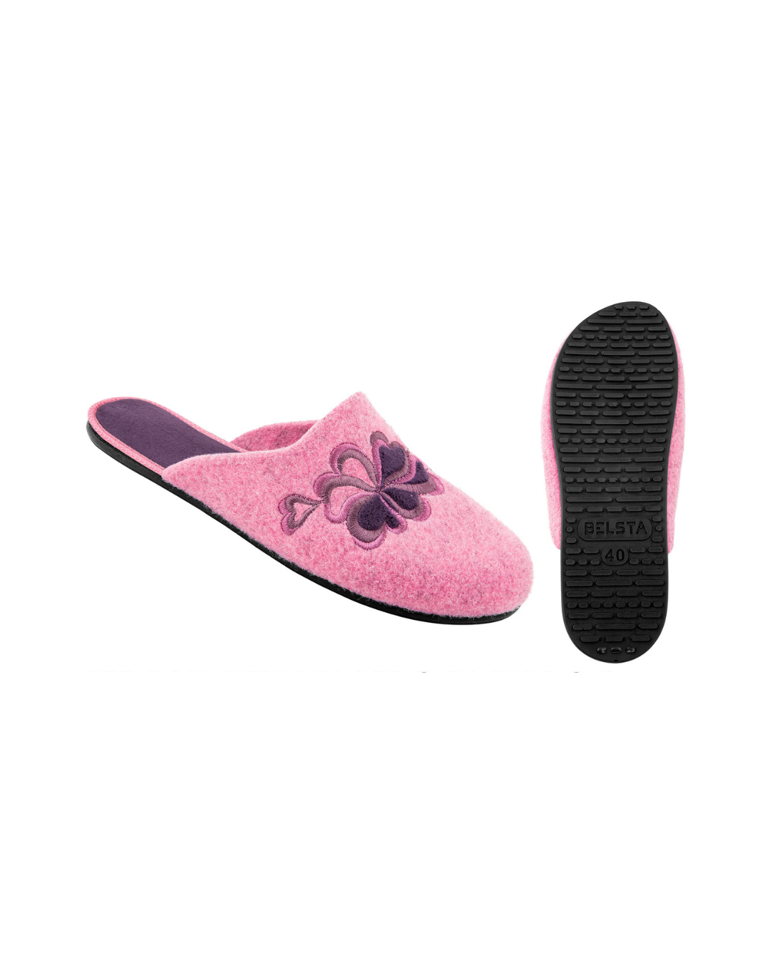 Papuci de damă închiși BELSTA din pâslă italiană roz, decorați cu broderie elegantă în formă de crin cu inimioară. Branțul este realizat din catifea violet-închisă. Model potrivit pentru purtare în sezoanele de tranziție și în perioada rece.