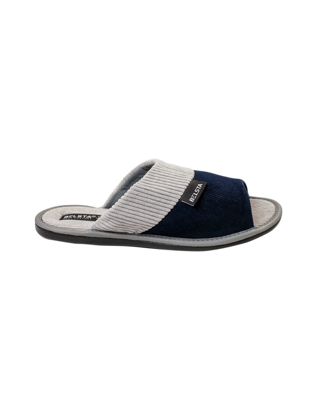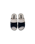 Papuci de damă deschiși BELSTA din catifea raiată albastră, decorați cu manșetă albă din același material. Branțul este realizat din catifea raiată albă. Model elegant și confortabil, potrivit pentru purtare în sezonul de tranziție și cel cald.
