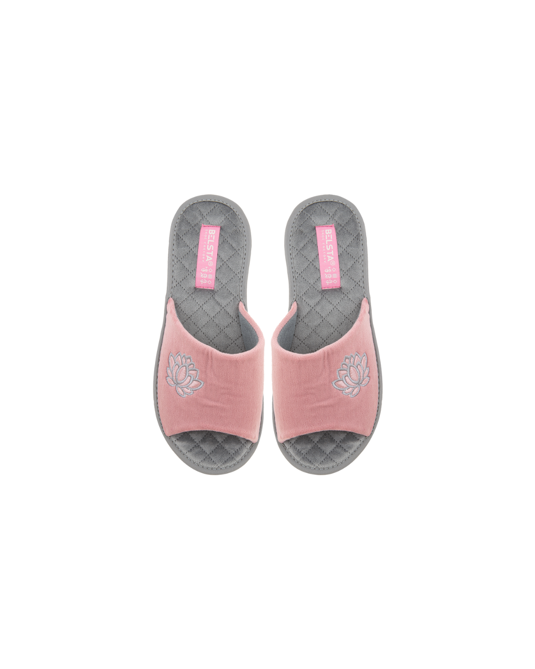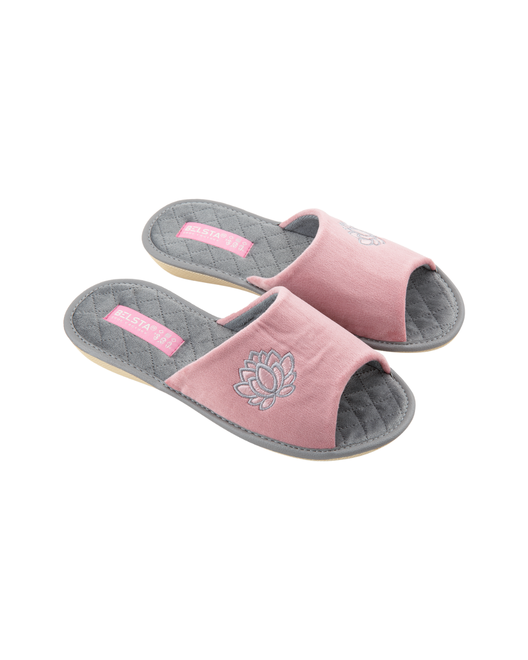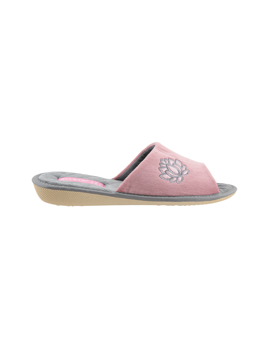 Papuci de damă deschiși BELSTA din catifea roz, decorați cu broderie în formă de floare. Branțul este realizat din catifea gri moale. Model confortabil, potrivit pentru purtare în sezonul de tranziție.