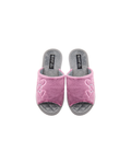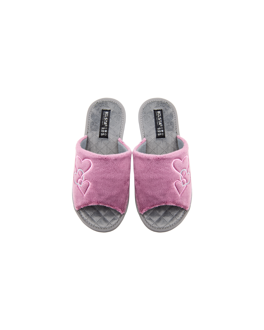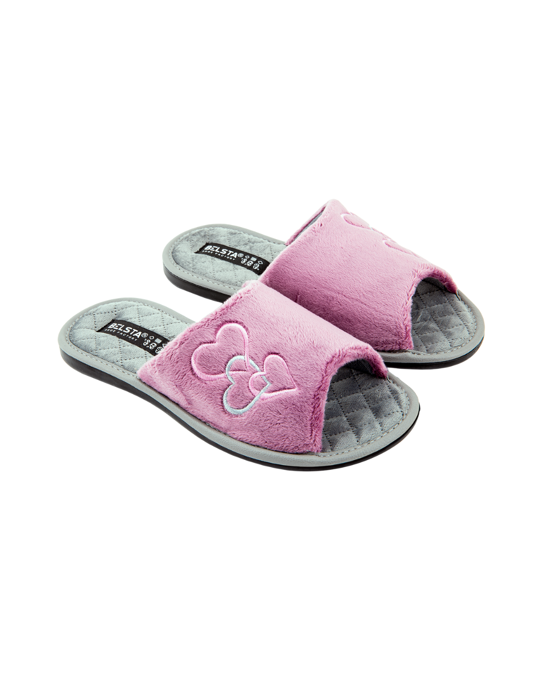 Papuci de damă deschiși BELSTA din catifea roz, decorați cu broderie în formă de inimioare. Branțul este realizat din catifea gri moale. Model confortabil, potrivit pentru purtare în sezonul de tranziție.