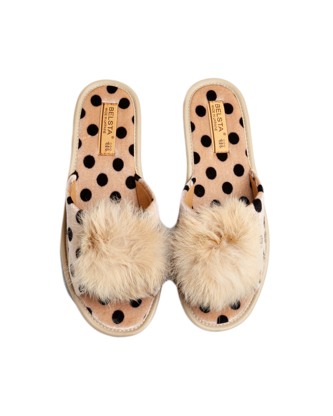 Papuci de damă deschiși BELSTA din catifea bej cu imprimeu în buline, decorați cu blăniță moale. Branțul este realizat din catifea maro. Model elegant și confortabil, potrivit pentru purtare atât vara, cât și iarna.