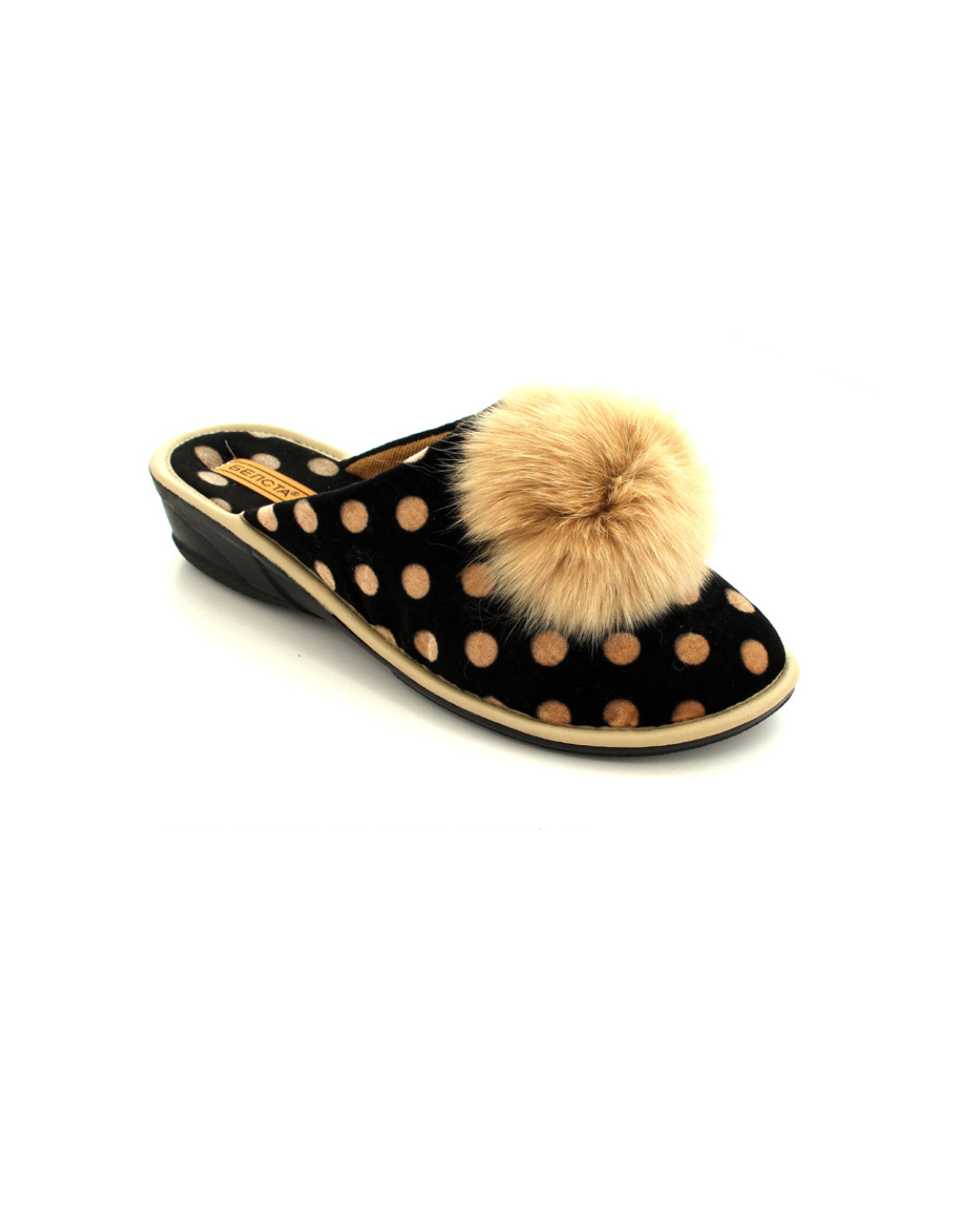 Papuci închiși de la producătorul BELSTA, confecționați din velur moale de culoare neagră cu imprimeu buline, decorați cu blană bej. Modelul are branț din velur și este conceput pentru confort și durabilitate în utilizarea zilnică acasă.