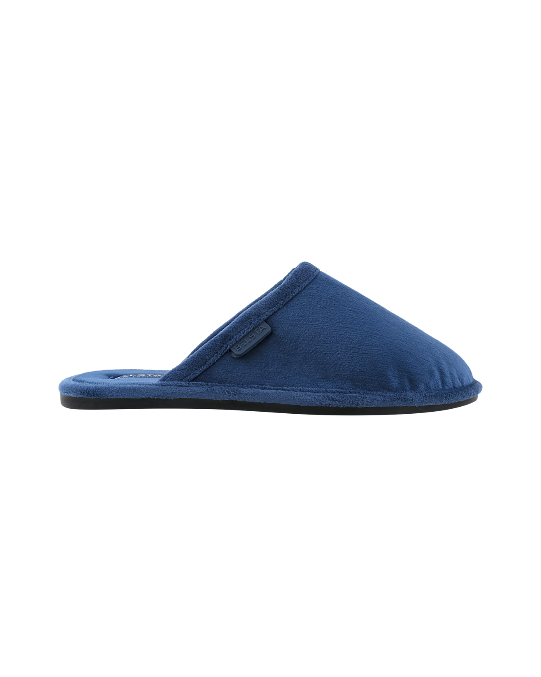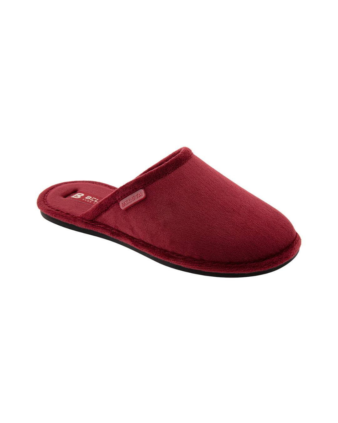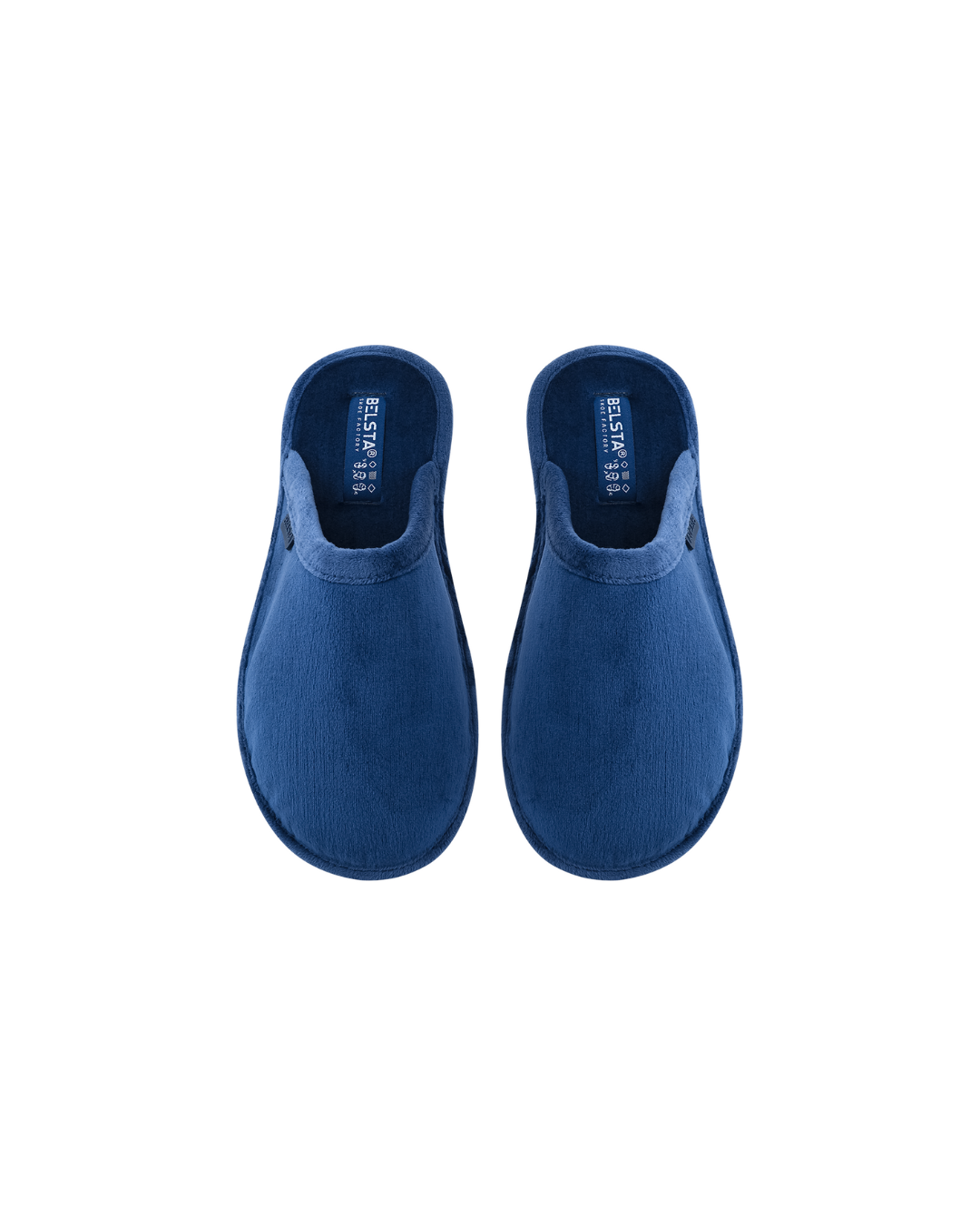 Papuci de damă BELSTA, închiși, din velur albastru; bordo închis, decorați cu denumirea fabricii