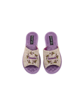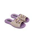 Papuci de damă BELSTA din textil bej, decorați cu broderie delicată în formă de lavandă. Model universal, potrivit pentru sezonul cald și perioadele de tranziție. Branțul este realizat din catifea matlasată de culoare mov deschis.