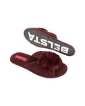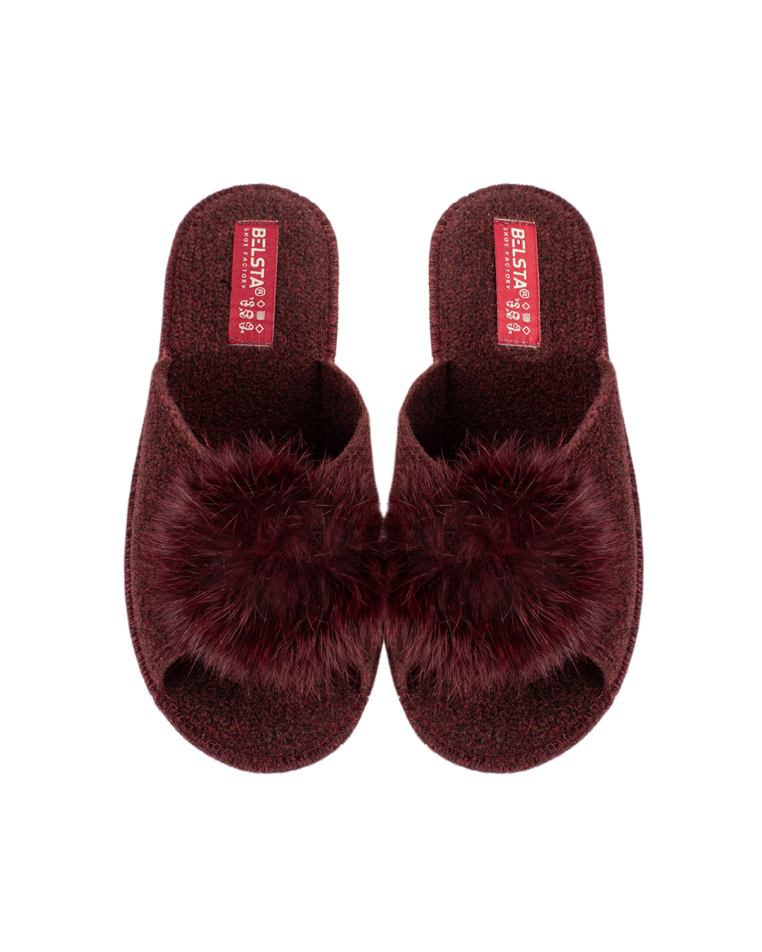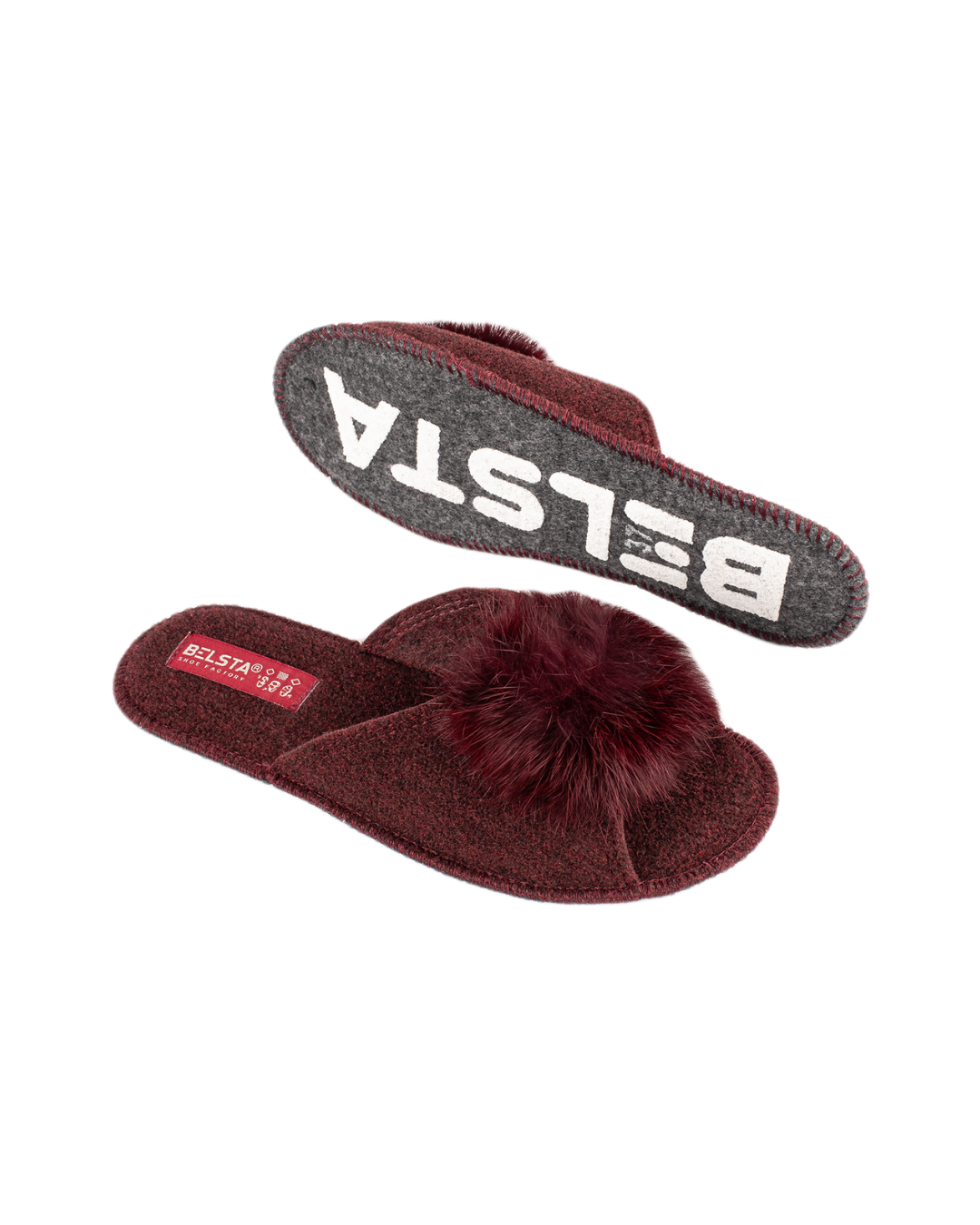 Papuci de damă deschiși BELSTA realizați din fetru italian bleumarin; bordo decorați cu blană moale. Branțul este realizat din fetru bleumarin; bordo italian. Model confortabil, potrivit pentru purtare în sezonul de tranziție.