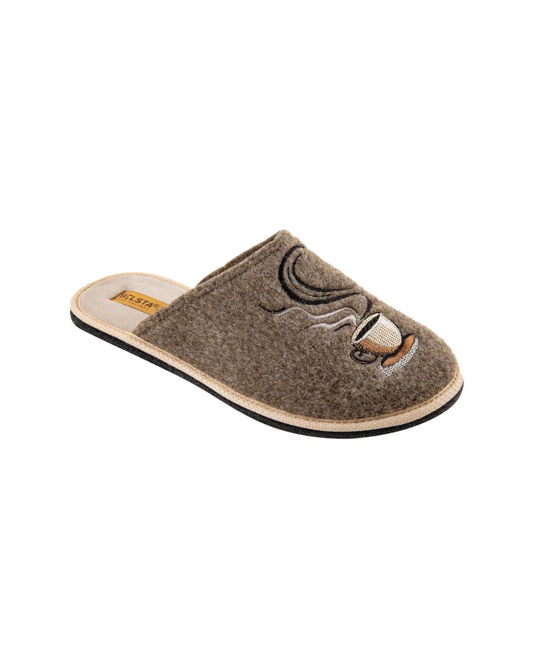 Papuci de damă BELSTA confecționați din pâslă italiană bej, decorați cu broderie în formă de ceașcă de cafea. Branțul este realizat din catifea crem moale. Model elegant, comod și potrivit pentru purtare în sezonul rece și cel de tranziție.