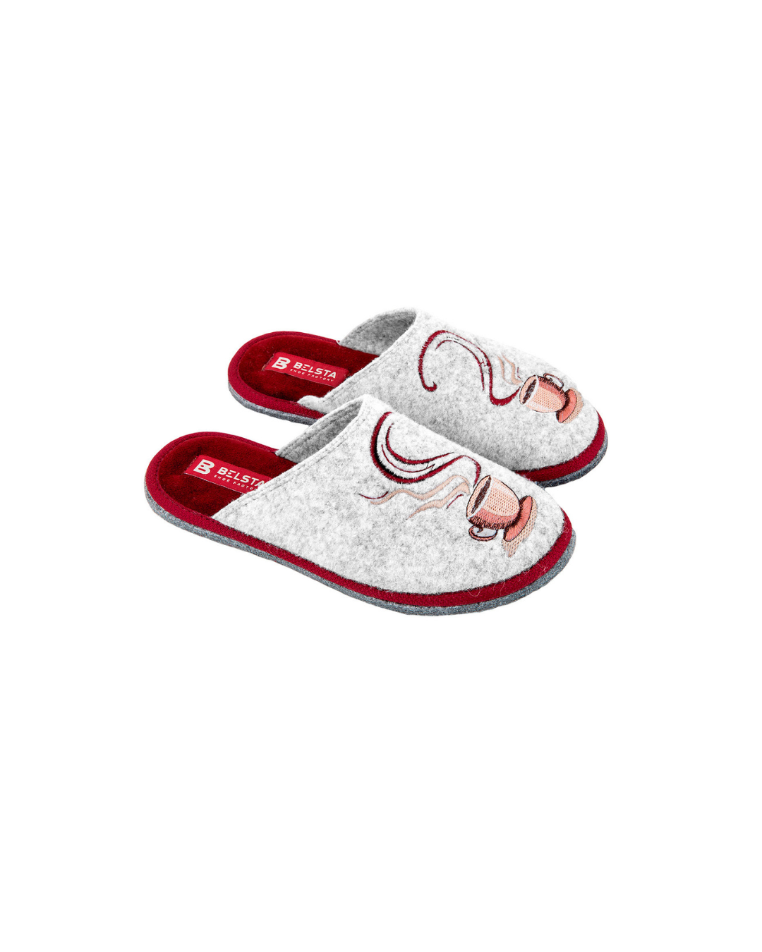 Papuci de damă BELSTA confecționați din pâslă italiană gri deschis, decorați cu broderie în formă de ceașcă de cafea. Branțul este realizat din catifea bordo moale. Model elegant și confortabil, ideal pentru purtare în sezonul rece.