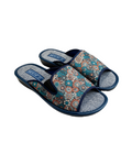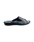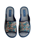 Papuci de damă deschiși BELSTA din material textil cu imprimeu floral în nuanțe de maro și albastru. Elasticul lateral permite ajustarea lățimii papucului. Branțul este realizat din material textil. Model potrivit pentru sezonul cald.