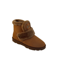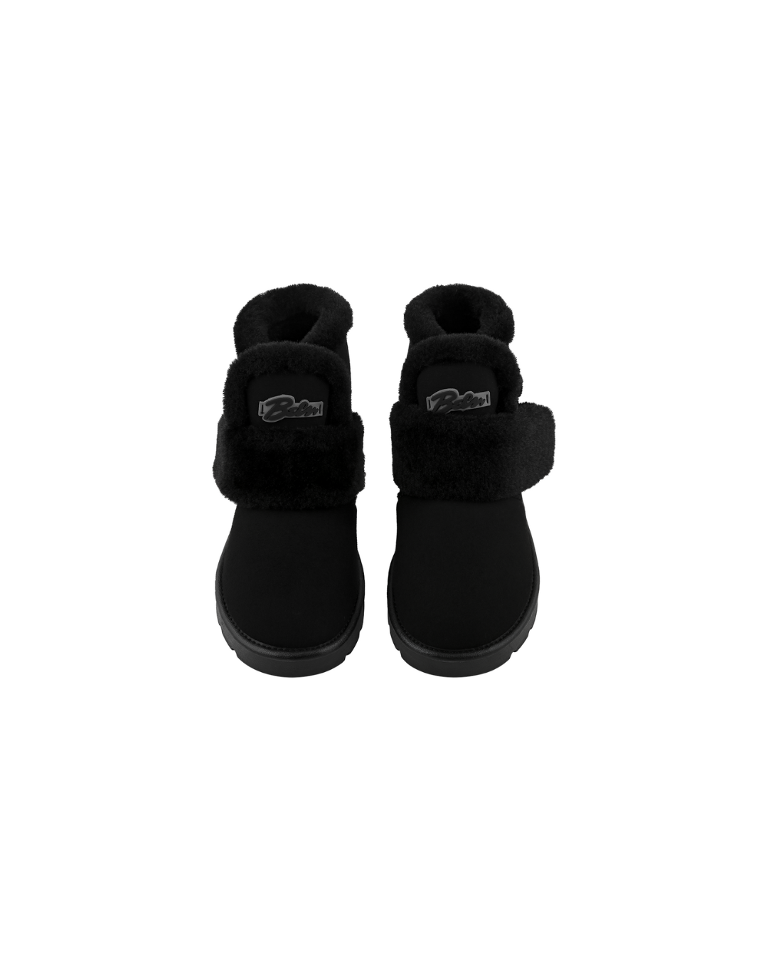 Papuci tip UGG de damă BELSTA confecționați din piele întoarsă ecologică bej; negru decorați cu manșetă din blană artificială și logo-ul fabricii. Interiorul este căptușit cu blană ecologică de miel, iar branțul este realizat din același material moale și călduros. Model prevăzut cu închidere tip arici (velcro).